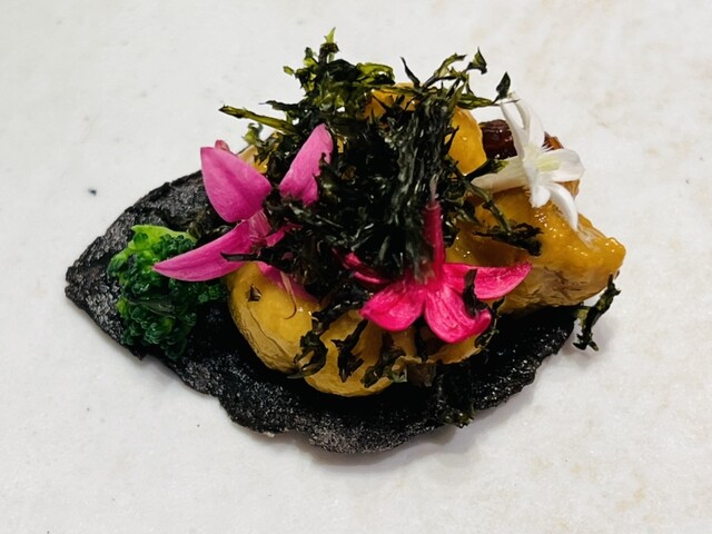 海苔の黒色のチップがカリカリで蕩ける雲丹とは対照的な食感ですが、非常に美味しい料理です。