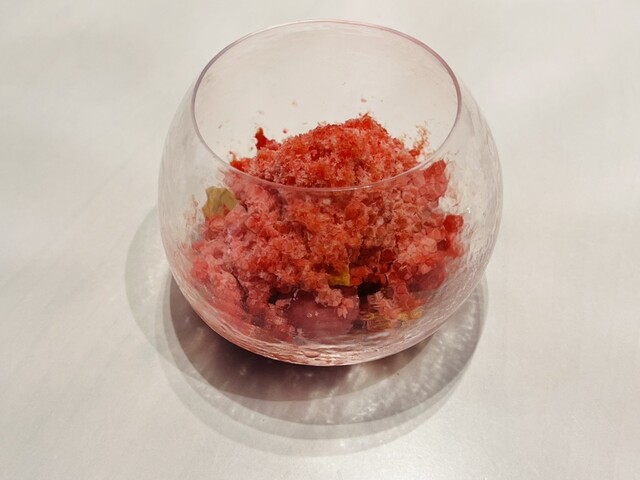 一番上には、玉葱のフリットやキューブ状にカットしたトマトや、レモンの皮をパウダー状にしたものや花穂じそをあしらっています。