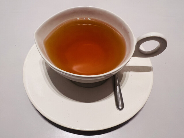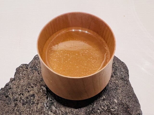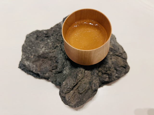 葛原シェフが伊勢神宮の近くの湧水を取りに行き、名古屋コーチンを昆布と塩のみで味付けした温かいスープです。