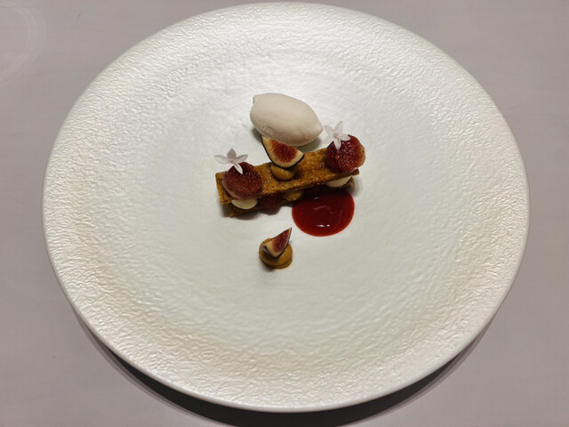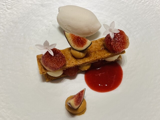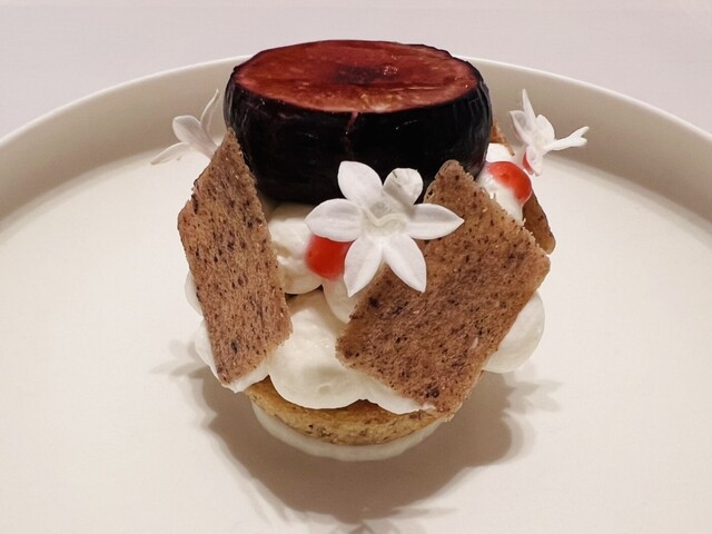 一番上にはフレッシュな無花果が乗っており、一番下にはレーズンと胡桃を使った生地を焼き上げたものがあります。