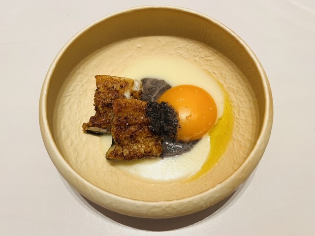 三河一色産の鰻を炭火で白焼にした料理を、愛知県で一番小さな鶏卵場で作られているたまゆら琥珀と言う玉子と絡めていただきます。