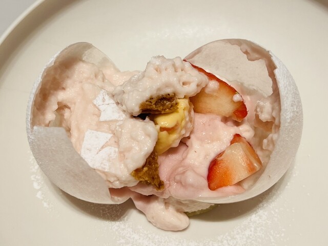 薄い飴で出来た球体の中に、フレッシュなイチゴやイチゴのクリームや練乳がソースとして入っています。