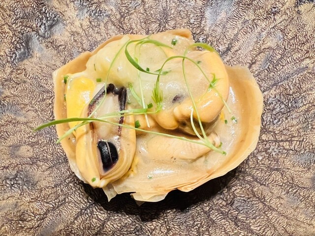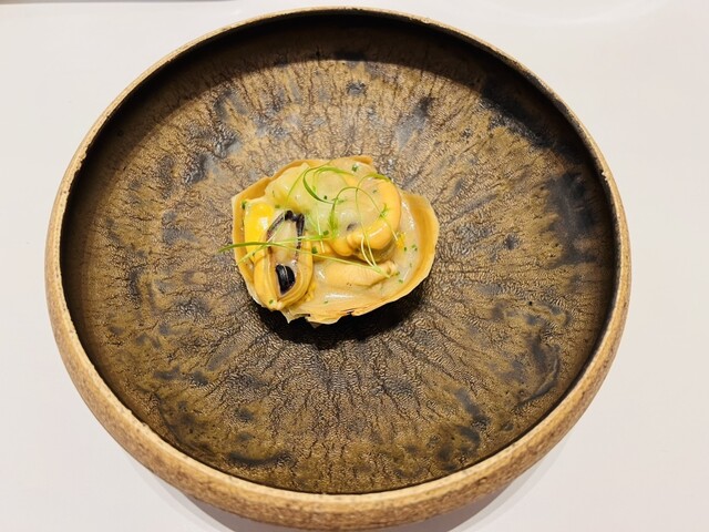 一番下にはカリフラワーを使ったピューレを敷いており、その上にはパートフィロと言うとうもろこし粉の生地の器の中に、蒸したムール貝や茄子、味わいのアクセントに白海老が入っています。