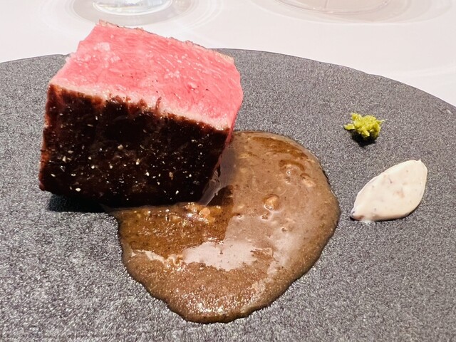 付け合わせには青カビのチーズ・赤ワインのソース・山葵があるので、好みでつけていただきます。