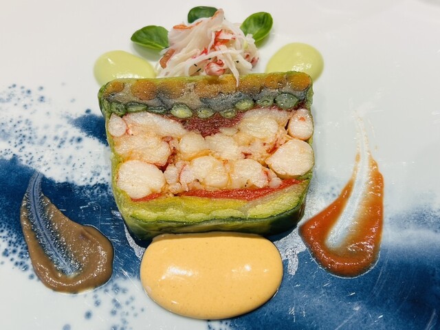 ぷりぷりのオマール海老がとても美味しい前菜です。