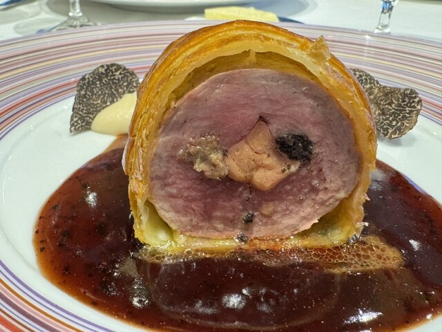 オーストラリア産3ヶ月の子羊(ベイビーラム)の赤身の部分にフォアグラとトリュフを詰めたパイの料理。
