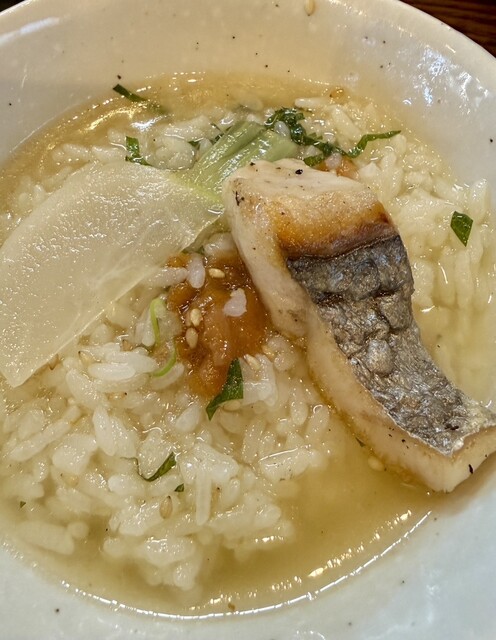 梅しそご飯に蕪と鰆の焼きをのせて塩スープをかけると〆のおじやが完成♪