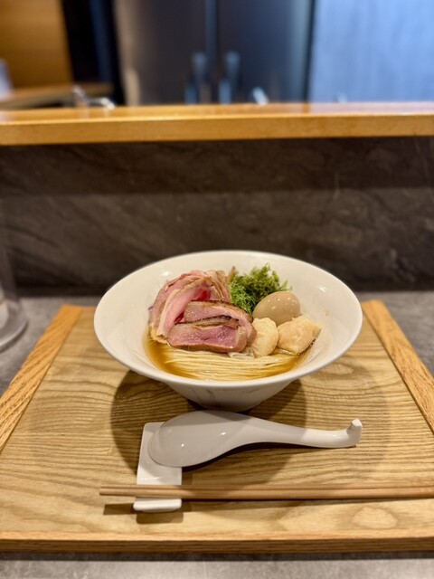 バラ海苔、豚ロース、鴨、味玉、メンマ、九条ねぎ、紫玉ねぎと彩りも味も最高です⭐️