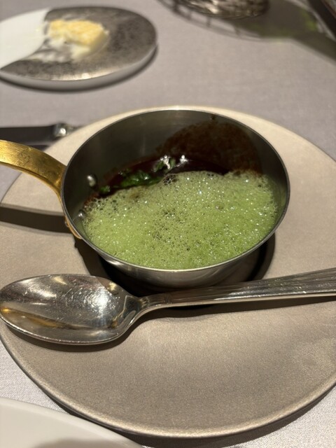 ペアリングを注文。ソムリエの方は、とても親切に色々と教えてくれました。店内が静か過ぎるのが気になりましたがお料理は、丁寧で美味しかったです。