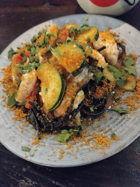旬の真鱈の白子と茄子のフリット、おでんの蟹のつみれなど、ランブルスコを飲みながら楽しむ。
