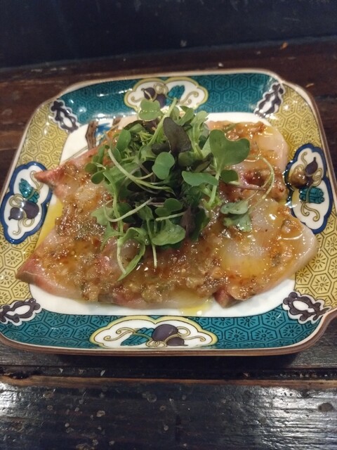 富士山サーモンのカルパッチョ、ヤゲン軟骨とキャベツのソテーは、どちらも味がかなり濃い目。