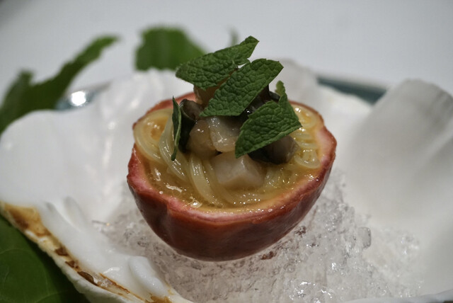 3品目は冷製パスタ。シャコ貝の上に中をくり抜いたパッションフルーツ、その中に盛られてます。見た目も去ることながら、感動的な美味しさ。コリッとしたシャコ貝の食感と磯の香りに、パッションフルーツの甘酸っぱさのマリアージュ。この1〜2口サイズが絶妙なんです…。