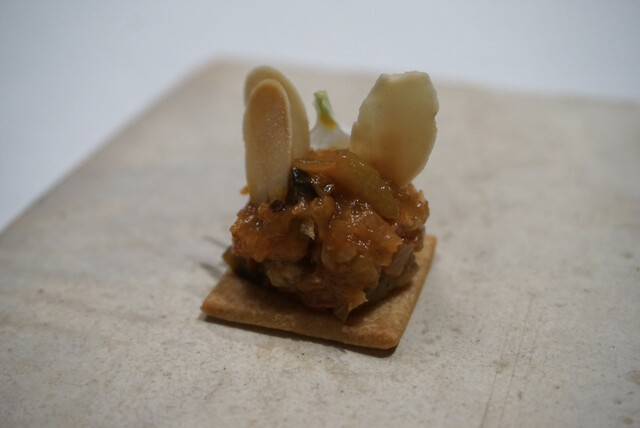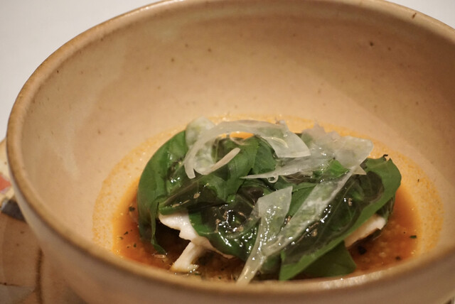 このフィレ肉、ナイフを入れる力がほとんど必要ないほど柔らかい。キメが細かい肉質で、昆布の相乗効果もあり、噛めば噛むほど旨みがジワリジワリと溢れてきます。ソースも美味しいですね…、隠し味の味噌が更なる深みを引き出している気がしました。