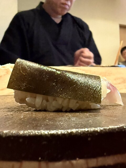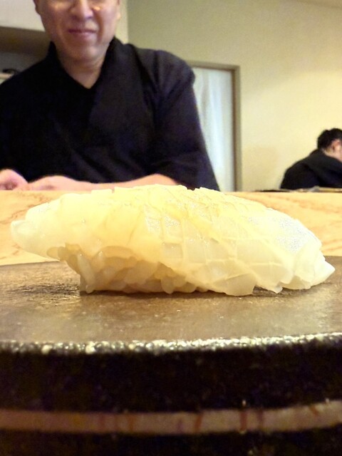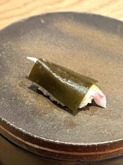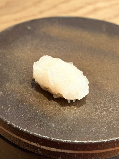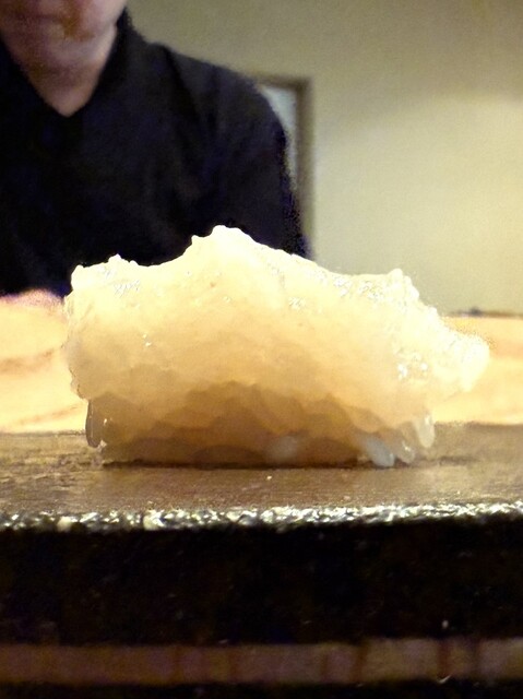 白身の王様 ノドグロの脂の旨みと、求肥昆布の旨みを掛け合わせる最強の布陣。ノドグロは言わずもがな、素晴らしいコクと口溶け、そこに求肥昆布の旨みの存在感。初めて食べた組み合わせで、ただただ感動しました。