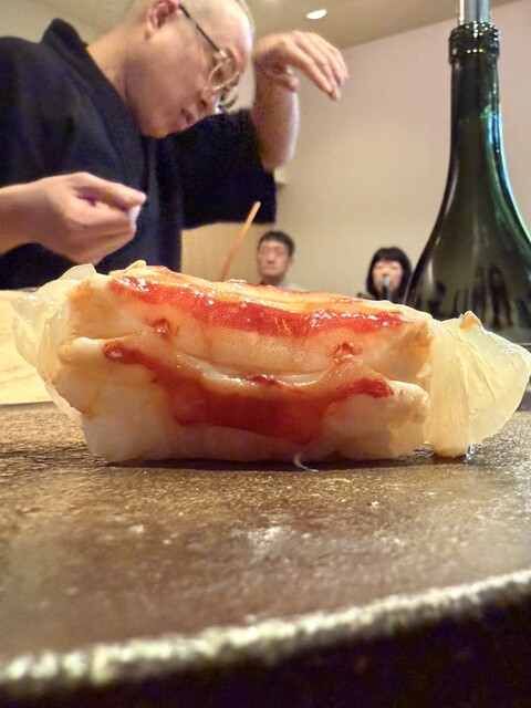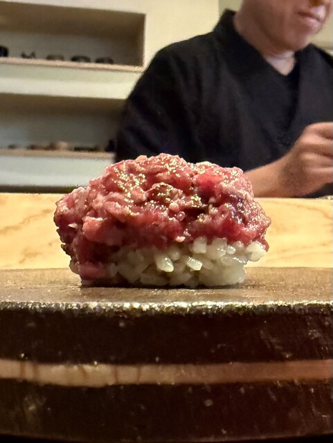 広島のブランド牛"榊山牛"のカイノミを漬けにした握り。ここで肉寿司か!と驚きましたが、とてつもなく旨い…。たたくことで旨みが溢れ、最終的に口の中で爆発します。カイノミなので脂のしつこさもなく、赤身部分の旨みを感じつつも、後味はとろけてなくなる堪能的な味わい。