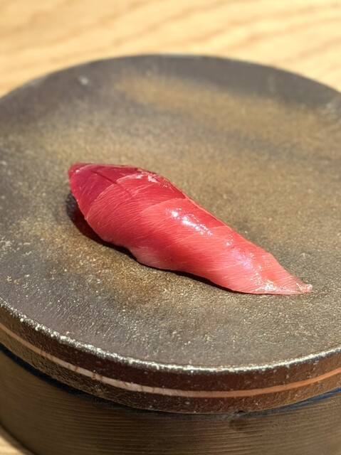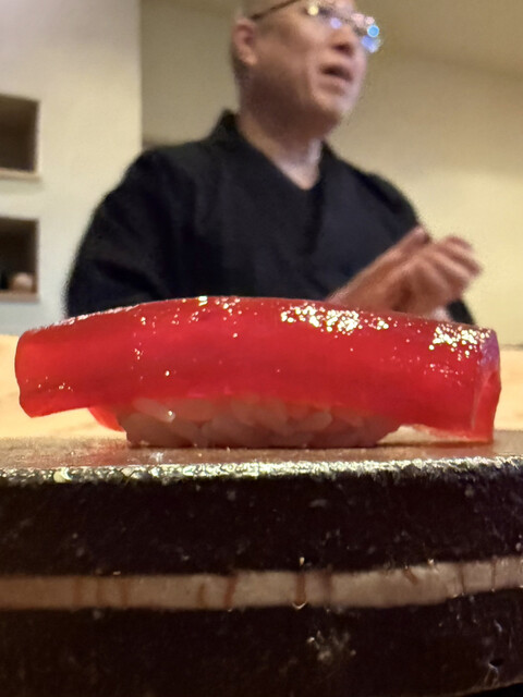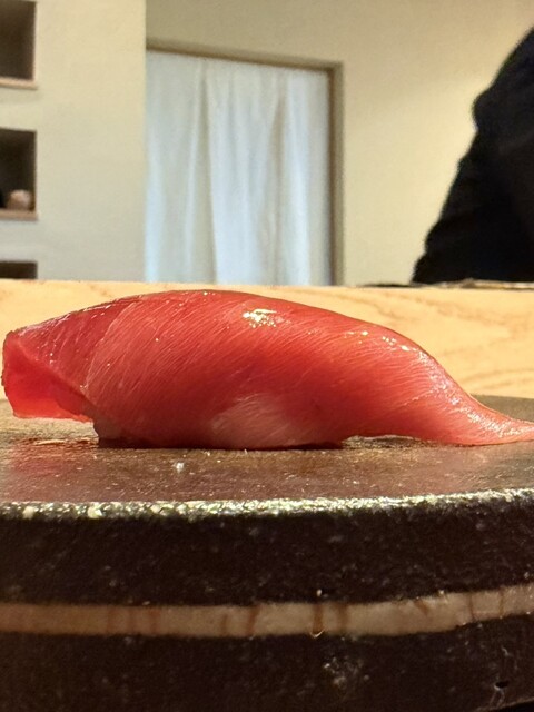 旨みが最も強いとも言われる血合ぎしの部分であり、一本買いでない限りなかなか手に入らない。宝石のような輝き…、口当たりはとろけますが、赤身の鉄分な味わいと、血合いぎしだからこその力強い旨みが合わさる逸貫。