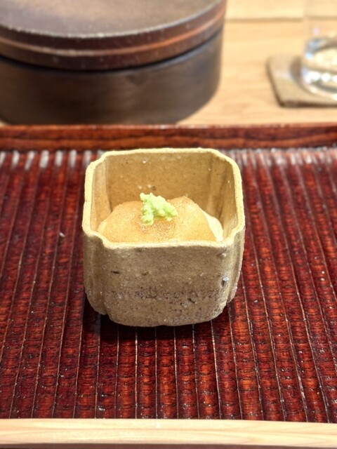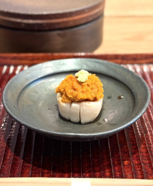 旨みを閉じ込めて煮た大粒の帆立と、甘みのある雲丹をあえて蒸してフワフワ濃厚な口当たりにした蒸し雲丹とのコンビネーション。蒸し雲丹が味噌のような深みがあり、これが帆立と相性抜群。酒のアテに極めて良し。