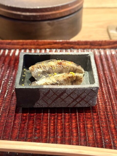 今まで食べたメヒカリの中で断トツ。まず、ここまで太ったメヒカリを見るのも初めて。フワットロッ…そして鼻から抜ける炭火の香ばしさ…。とんでもない焼物ですね、メヒカリのポテンシャルの高さに驚き。