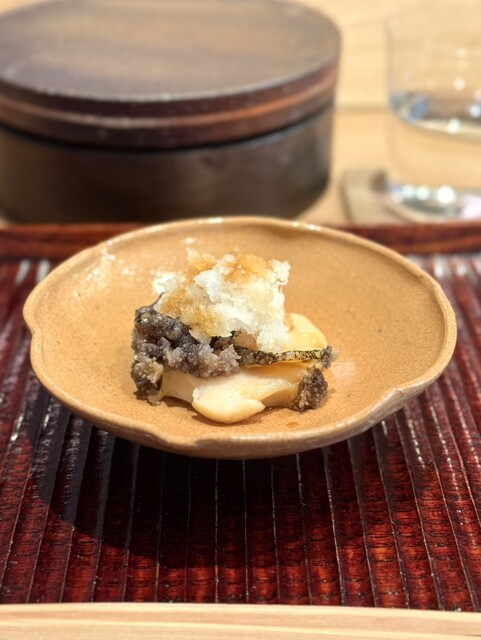 巨大な黒鮑、ブリンブリン、コリッコリの身質。それを出汁で煮ておろしポン酢で…。シンプルながら、鮑の味わいを限界まで引き出してます。唐墨で濃い味寄りになった口を、さっぱりとおろしでリセット出来ました。