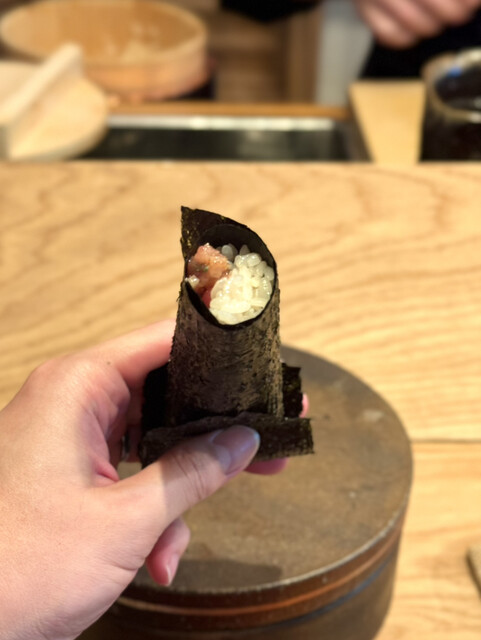 中トロに、浅葱、アクセントにいぶりがっこ。個人的には沢庵よりいぶりがっこの方が好きなので、これまたハッピー。パリパリの海苔、とろける中トロ、浅葱の風味にいぶりがっこの食感と燻感。ラストに相応しい一本でした。