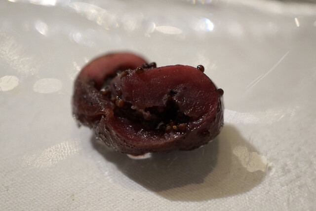ウシマルでは、山武産のアミノ酸豊富な経産和牛を使用。店によっては硬さしか感じない経産和牛ですが、打矢シェフの魔法により、概念が変わるレベル。1つは、巨大なブリスケットの部分。特に硬くなりがちな印象ですが、繊維に沿ってスッと解ける柔らかさ。合わせるソースは、香味野菜とバルサミコに、ゴーヤとディル。ほんのり酸味に、ゴーヤとディルのほろ苦さとハーブな香り。もう1つは、赤みが美しいヒレ。シンプルに自家製の塩でいただきますが、フォークで簡単に裂けるレベルの柔らかさ。旨みも濃く、ヘルシーでいくらでも食べられそうでした。