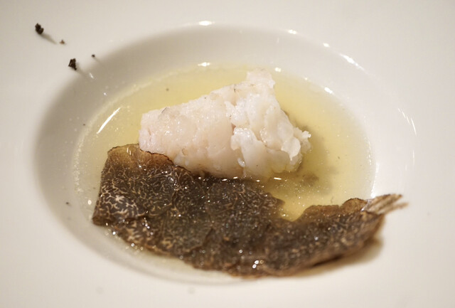 ・九十九里産 神経〆カサゴ 炭焼き、真鴨のスープ、黒トリュフ