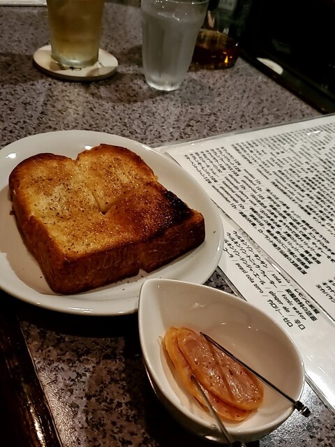 軽いオツマミあります。トーストとか。右下は日野市五太子商店の鶏サラミ。凄ウマです!
