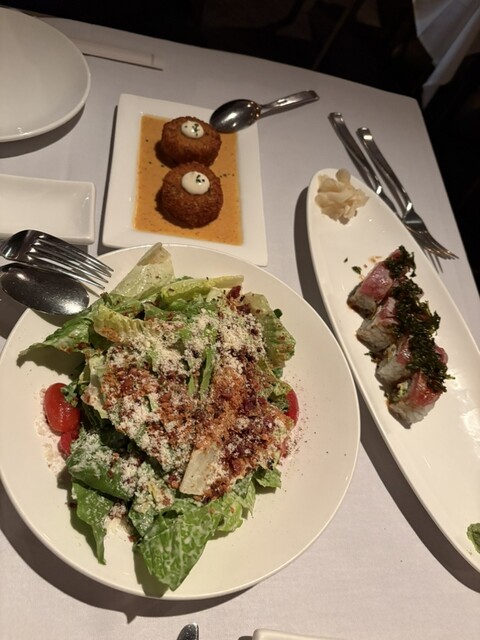 シーザーサラダ、クラブケーキ、アヒ20ロール、ヒバチグリルサーモンを注文