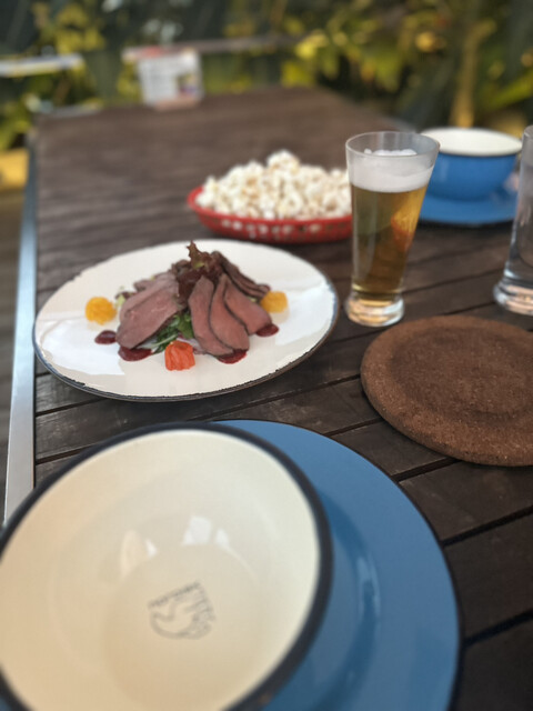 オーソドックスな串や骨付き肉だけではなく、アヒージョや、自分で作るホットドッグ、特に木の板の上にオレンジとチキンを乗せてスモークするお料理があり、発想がすごいな!と思いました。どれも美味しかったです。