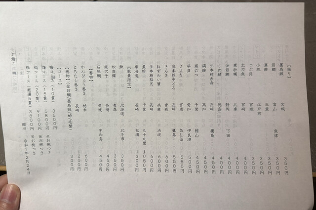 墨烏賊、目鯛、真鯵、小肌、つぶ貝、太刀魚、煮牡蠣、金目鯛、シメサバ、生本鮪赤身が出てくる。