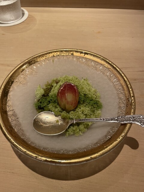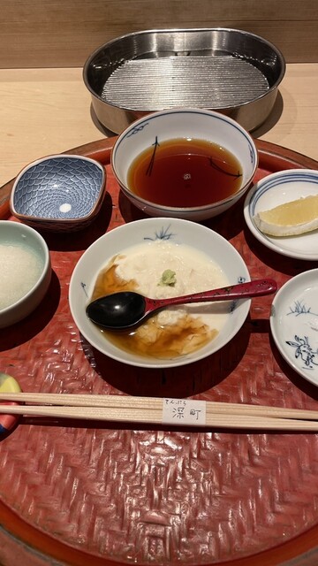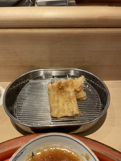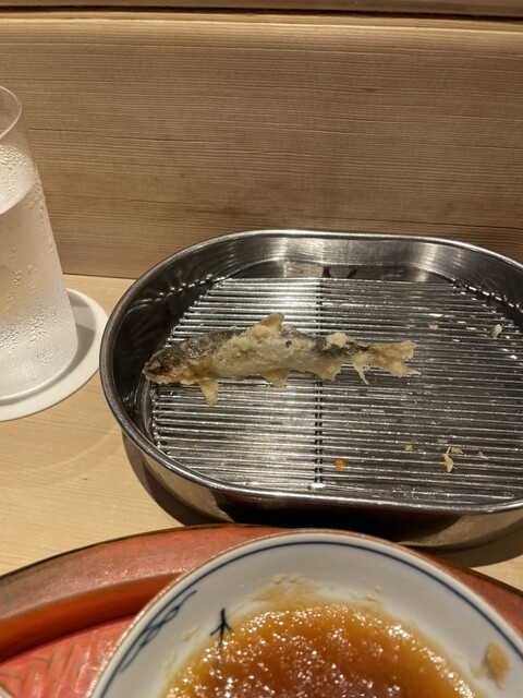 海老2、あわび、とうもろこし、ししとう、きす、うに、はも、なすび、れんこん、鮎、アスパラガス、あなご、天丼(天茶追加)、〆のデザート。