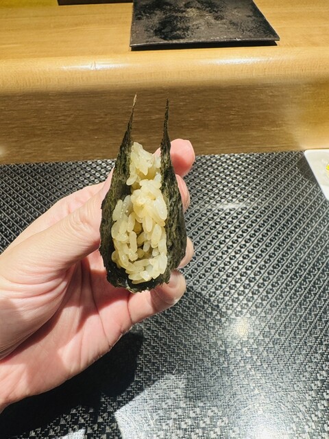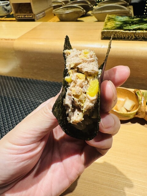 鮨コース(ソフトドリンク飲み放題)(1.8万)にトロたく(手巻き)、トロたく(おはぎ)、ウニ、キンキを追加しても2.5万くらいです。追加なしなら1.8万というハイコスパなので、大将とアキ君の経営努力のおかげだと思います。まず切りたてのシャリが一品目ですが、このシャリがとても美味しいです。本日、二品目のタラの白子ソースの茶碗蒸しは絶品で、お客さんみんなから美味しいという声が連発してました。その他の料理もとても美味しくて、この値段をキープしてくれてるのはとてもありがたいです。本日特に美味しかったのは、白甘鯛(絶品です。かなり良いものをつかってます)、キンキ、タラの白子ソースの茶碗蒸し、ブリのしゃぶしゃぶ(脂がのってますが、大根おろしとお出汁で頂くことであっさり頂けます)、タイ、トロでした。定期的に通ってますが、進化し続けており、今後も楽しみです。
