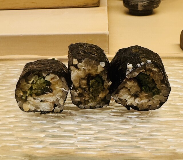 焼くことで白子の味が濃くなり、海苔の塩味と風味、シャリのハーモニーが抜群です。鼻から抜けてくる海苔の香りを楽しみながらよく噛んで食べました。