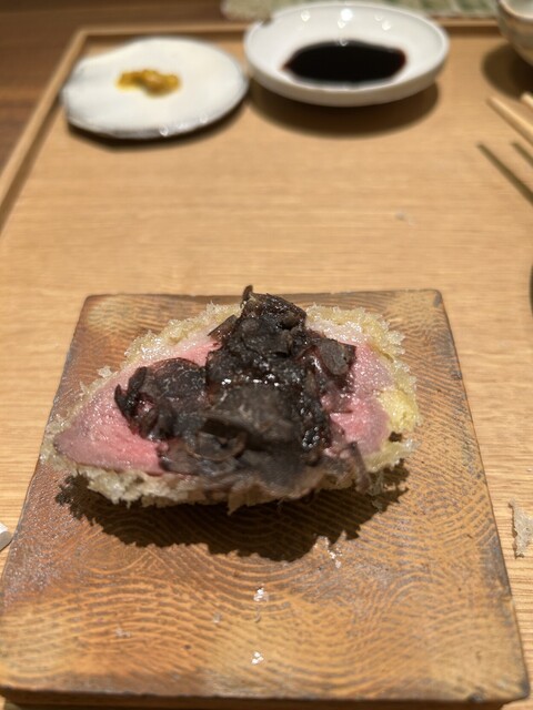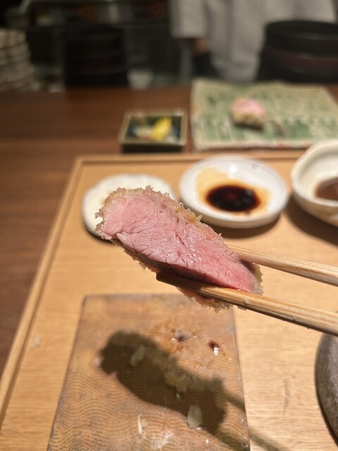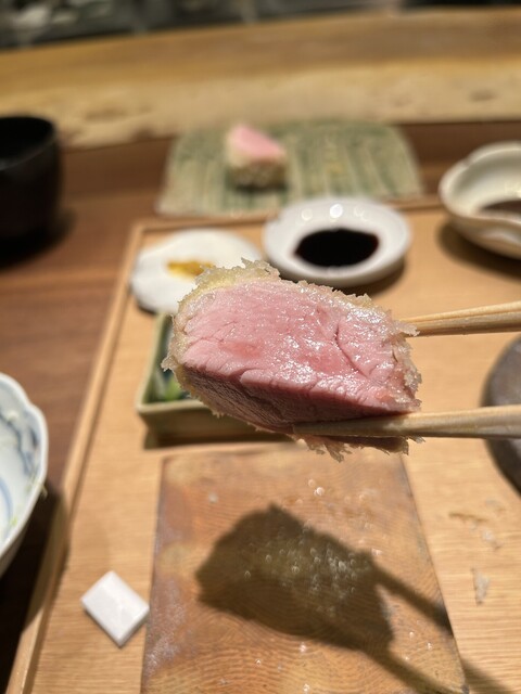 カツ小皿:高坂鶏(日本一おいしい鶏を目指して開発された)のカツ、タラの芽のカツの2種をバルサミコソースで食べます。うまい!