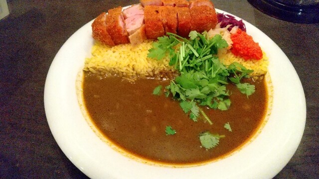 ルーがまた美味しい!パクチーを添えながらターメリックライスかな?ルーと併せて食べます。