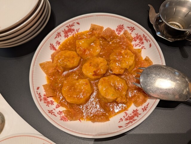 アラカルトの海老チリ。スパイシーではなく、意外に甘さが先行するもの。しかし美味さは町中華では味わえない一品。