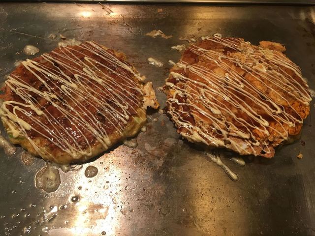 お好み焼きも焼き加減よく綺麗に仕上げてもらい、甘めと辛めのソース2種おいてありますが個人の好みで足してもらって可というスタイルです。