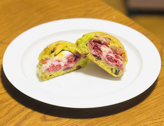 ※ピスタチオペーストを練り込んだ生地にドライイチゴとクランベリーを合わせ、無塩クリームチーズとフランボワーズとホワイトチョコを包み焼き上げました