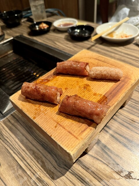 ジャンボ名物の薄切り和牛を焼いて、旨茶飯で握ったシャリの上に乗せて