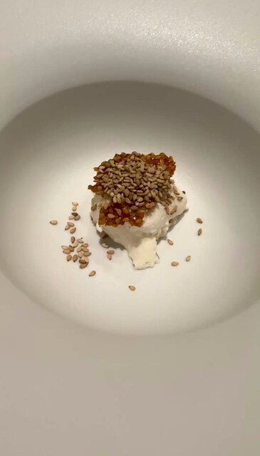 サクッと焼き上げたサブレ生地に、海援鯛を昆布で締めて熟成させてタルタル状にしたもの、その上に小さなイワシが丸ごと!スナックのカールのような脂の乗った食感✨