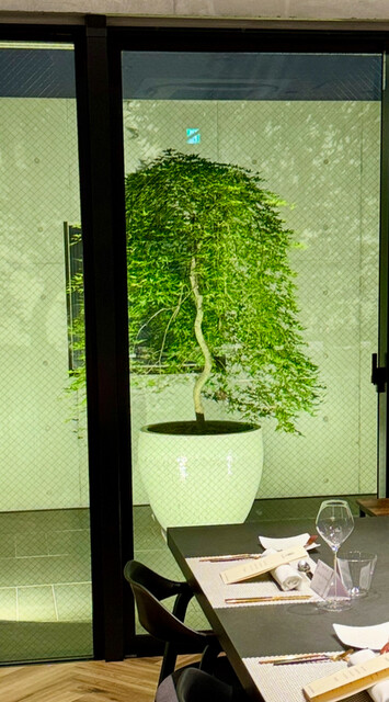 ちなみに、店名のL'ARBRE (ラルブル)はフランス語で「樹木」という意味。菊池正樹シェフの名前から「樹」の1文字をインスピレーションの起点に、店名やロゴに想いが込められています。店の奥のテラスには紅葉の木が象徴的に配置され、緑や紅葉など四季を通じて彩りを楽しめるコンセプト。
