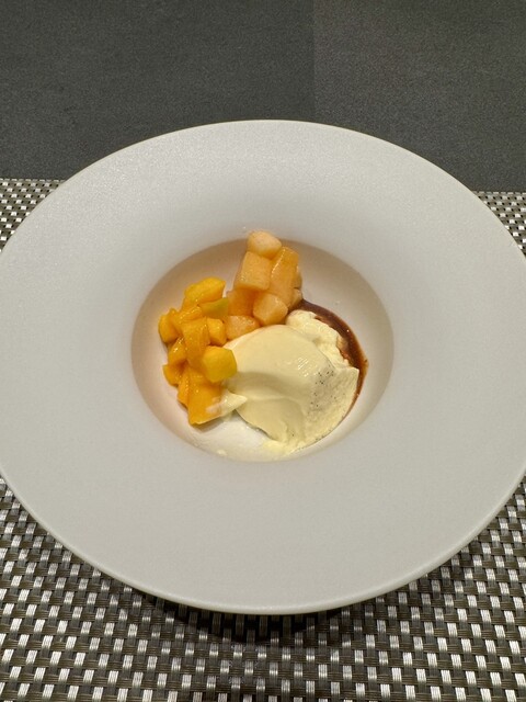 蝦夷鹿のロースト、フォアグラのソース、木苺のピューレ。鹿肉の断面は濃厚な赤で、フォアグラソースと絶妙にマッチ!繊細でありながらしっかりとした重厚な味わい。雪の中で鹿のハントの瞬間も語ってくれました。熟成させず、雪を使用しそのまま新鮮な状態を保つこだわり。