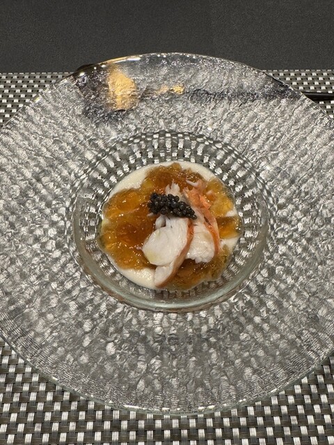 オマール海老や海老など甲殻類で作ったコンソメのジュレ、伊勢エビとキャビアたまらない!