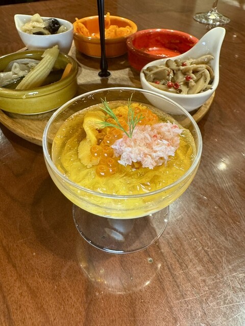 ・ウニ、いくら、ズワイガニ、カリフラワーのムース オマール海老のコンソメジュレ