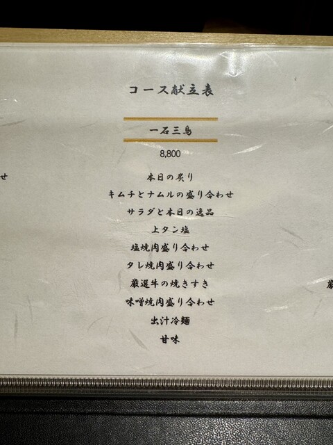 お肉の前菜にはじまり、焼肉は上タン塩にはじまり、塩焼肉、タレ焼肉、味噌焼き、焼きすきまで、一石三鳥のフルコースを堪能できるお得感満載なコース✨