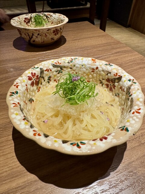 〆の鯖出汁の冷麺が感動の美味しさ。シャーベット状の鯖出汁の上に九条葱✨さっぱりとしていながら奥深い出汁の味わい。ツルツルと心地良い食感がたまらない✨また食べたい一品!