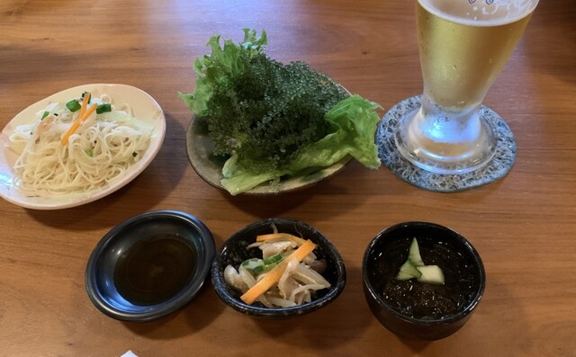 ホテルからフクギ並木を散策しながらお店に到着。塩味の効いたプチプチの海ぶどうや甘みのある豚しゃぶをビールや泡盛と共に堪能しました。古民家風の落ち着いた佇まいもあり満足。
