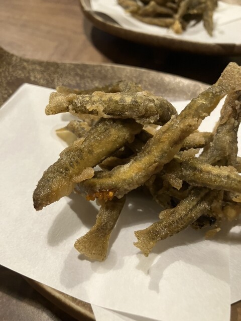 鮎の刺身は、瓜科の香りは身からではないのだなと、澄んだ水の上にジワッと旨みがくる。雑炊や焼きの西瓜の香りとまた別の香魚。あまごは、養殖物は鮎も天魚も食べた事ないと言う女将さんの「香り鮎なら味、あまご」というしっかりした旨みある塩焼き。お酒進みます。進むと言えばこの地域のみとのチチコとアジメ、不思議と揚げ物がいつまでもつまんでいられる、お酒の友でまたこの季節に食べたいなと思います。