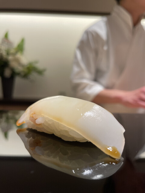 広尾駅から徒歩約3分、広尾商店街を少し入った静かな立地にあるお鮨屋さん。カウンター席のみの小体な造りで、9席ほど。完全予約制でランチ営業は限られた曜日のみ。