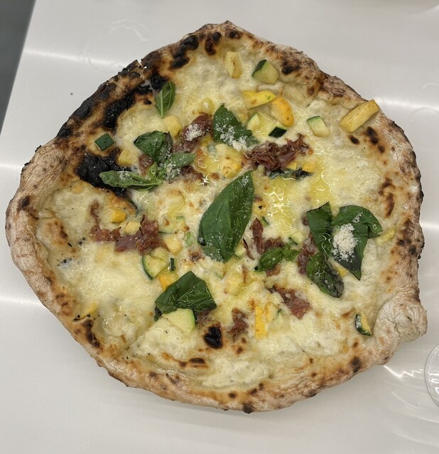 今回のスペシャルピッツァは、ピーマンやナスなどの旬野菜とサルシッチャを組み合わせた、バジルソースベースのピッツァ。野菜と肉の旨味が合わさった最高の一枚で、絶品すぎた。